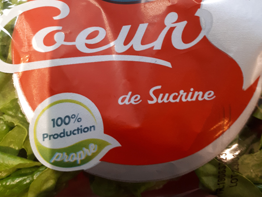 Je ne résiste pas au plaisir de partager avec vous ce magnifique cas de greenwashing sur un emballage produit : la salade en sachet “cœur de sucrine” de la marque Lucas, importée d’Espagne, qui s’affiche “100% Production propre” avec un beau logo rond et vert.